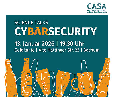 Am 13. Januar um 19:30 Uhr decken IT-Sicherheitsexpert*innen des Exzellenzclusters CASA am Horst-Görtz-Institut für IT-Sicherheit und dem Max-Planck-Institut für Sicherheit und Privatsphäre für euch die unsichtbaren Gefahren des Internets auf. In der vierten Ausgabe der Veranstaltungsreihe sind unsere Forschenden zu Gast in der Bochumer Bar „Goldkante“, um exklusive Einblicke in aktuelle Themen der Bochumer Cybersicherheitsforschung zu geben - für Laien verständlich und in lockerer Baratmosphäre.