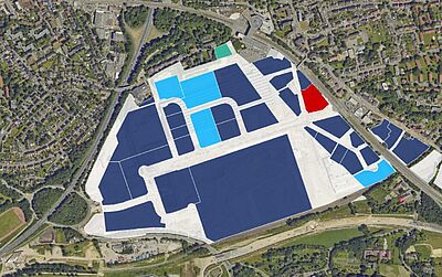 Das Grundstück des Neubaus der Fakultät für Informatik in rot markiert.